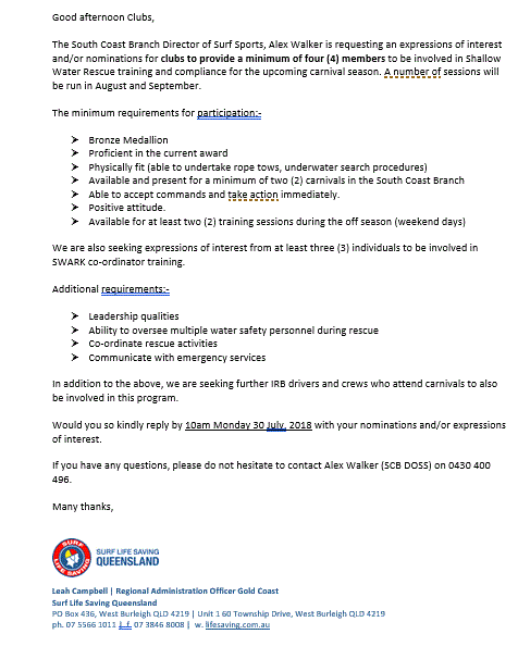 Members interested in providing support and services for the event are asked to contact the club by the 26th August with your availability for either day. secretary@broadbeachslsc.com